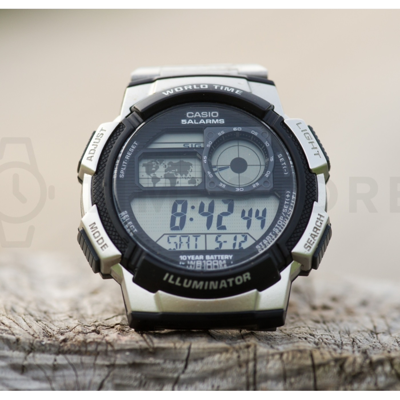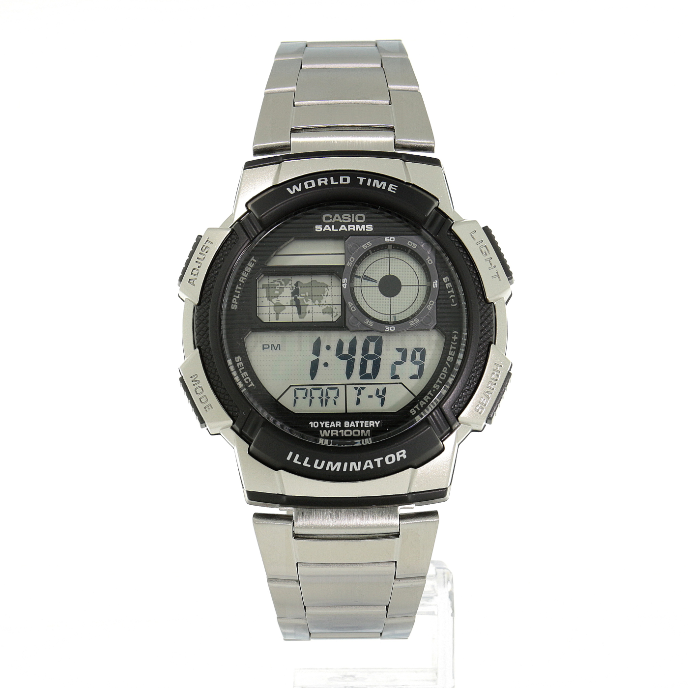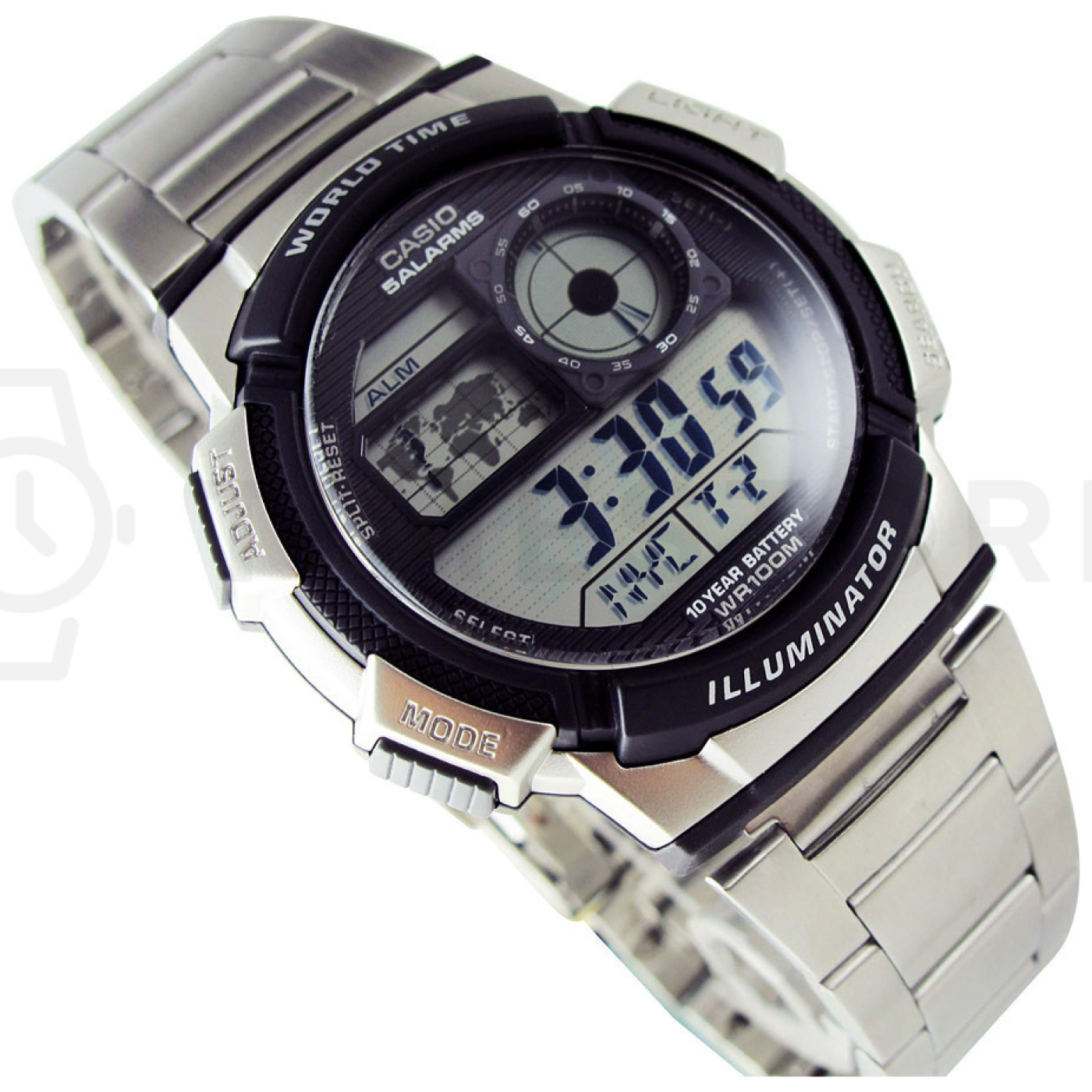 • Ogólnie muszę powiedzieć, że ten zegarek ma dobry stosunek ceny do wydajności. Ma plastikową kopertę, która jest malowana w kolorze srebrnym, aby wyglądała jak stal. Spodziewam się, że kolor z czasem się będzie ścierał. Koperta znajduje się tylko u góry i u dołu, dzięki czemu szkiełko po bokach wystaje. Bransoletka wykonana jest ze stali chirurgicznej i jest cienka. Nie da się od niej tak łatwo odłączyć poszczególne ogniwka. Klamra jest mocna i posiada cztery otwory do regulacji rozmiaru. Wszystkie niezbędne funkcje zegarek posiada, sterowanie jest dość intuicyjne. Pokazuje czas światowy, do wyboru jest 31 stref czasowych (w tym takich, w których czas zmienia się tylko o pół godziny zamiast całej, jak Afganistan czy Nowfoundland). Mapa stref czasowych jest trochę bezużyteczna. Cyfrowy wyświetlacz pokazuje 4 wybrane strefy czasowe, ale data i alarmy są tylko na ekranie głównym. Zegar analogowy zawsze pokazuje wyjściową strefę czasową. W ten sposób jednocześnie mogą być wyświetlane dwie strefy. Podświetlenie jest nieco nierówne, wyświetlacz oświetla jedna dioda LED umieszczona w pozycji 7:30.