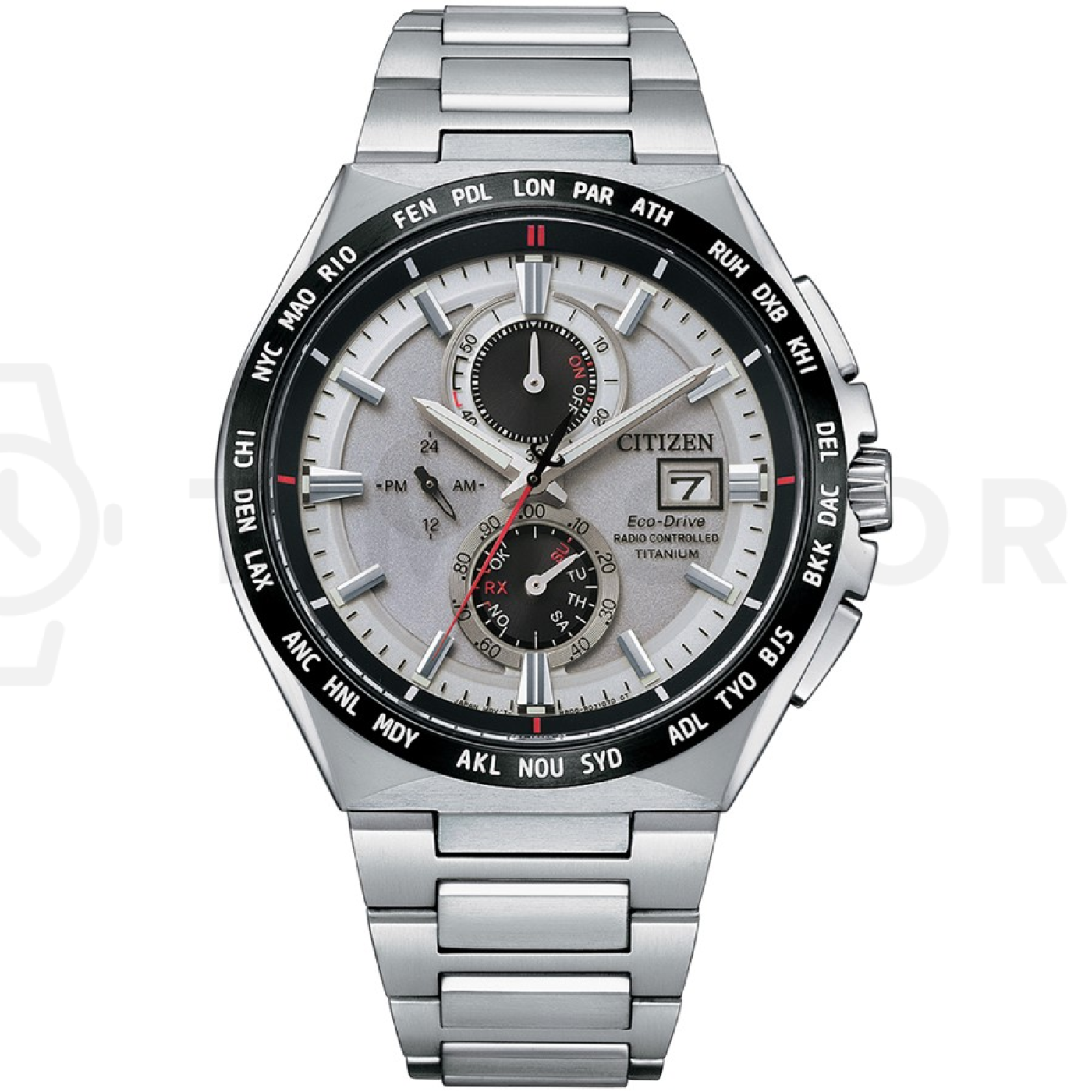 Luminescencyjne wskazówki, Chronograf, Luminescencyjne indeksy, Sterowany radiowo, Dzień tygodnia, 24-godzinowa sub-tarcza